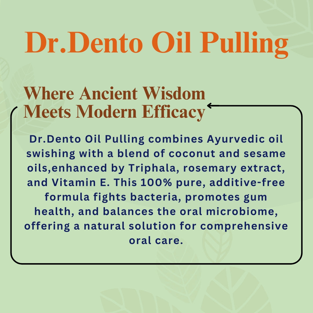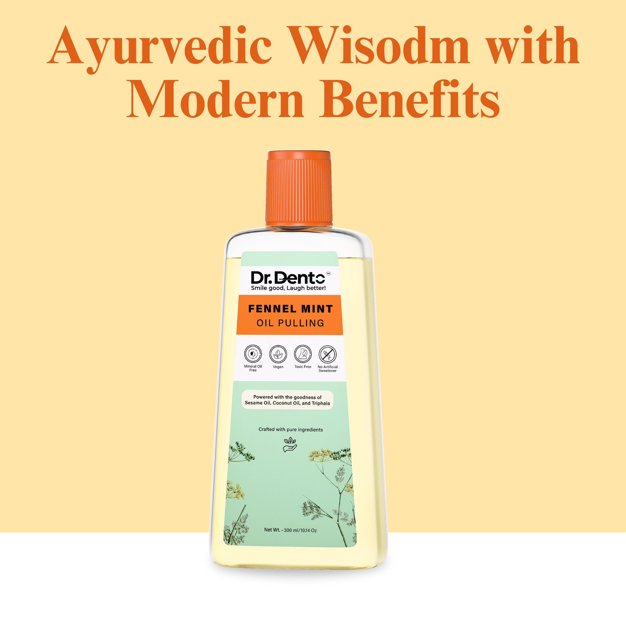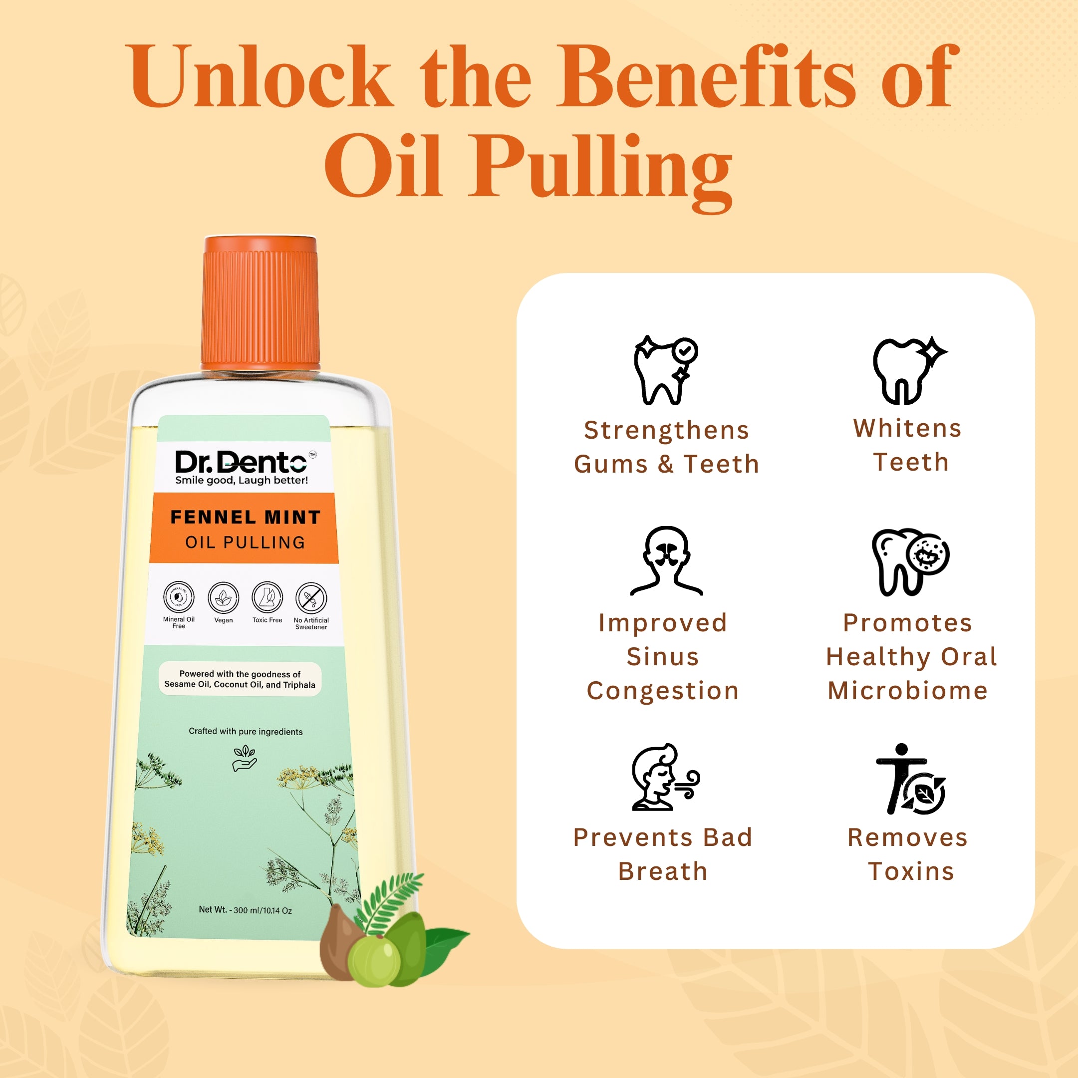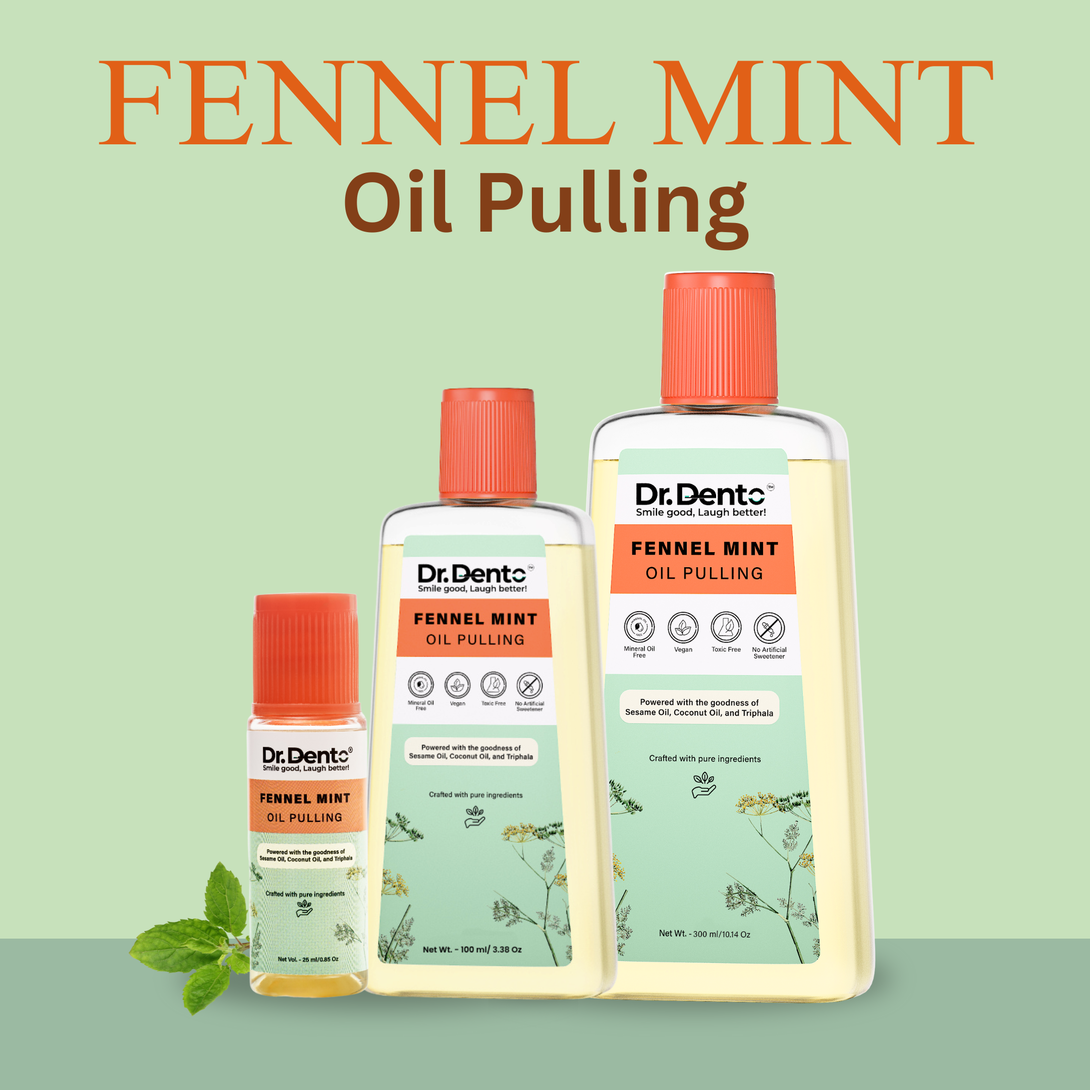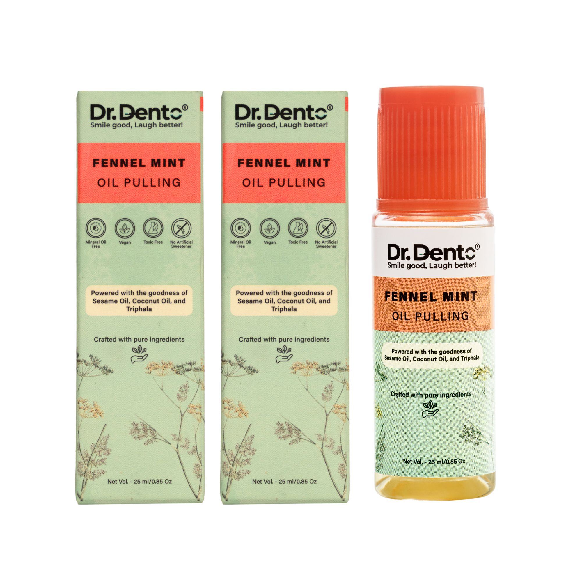 Use our Fennel mint oil pulling twice a day before brushing your teeth with Dr.Dento’s toothpaste and rinsing it with our alcohol-free mouthwash, in the morning and at night!